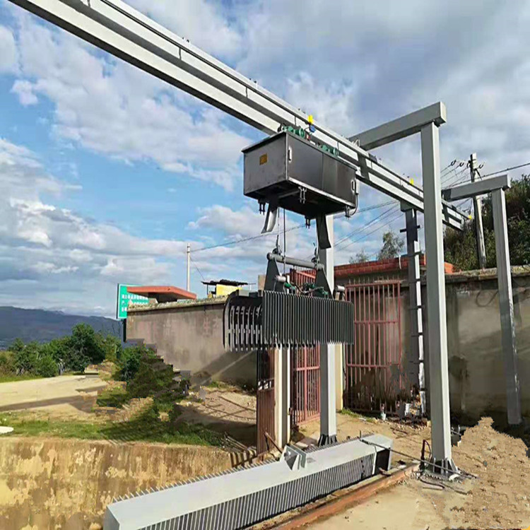 移動式格柵清污機結構 移動式格柵整機包括格柵片、機架、工作平臺、行走機構、清污機構、翻耙機構、垃圾小車、18kg/m輕軌、過載保護裝置、鋼絲繩防松裝置及行程控制、電氣控制箱。電源、驅動執行結構和控制系統、電控箱等驅動執行結構和控制系統位于機架上,同時為施工單位提供相關預留預埋件。
